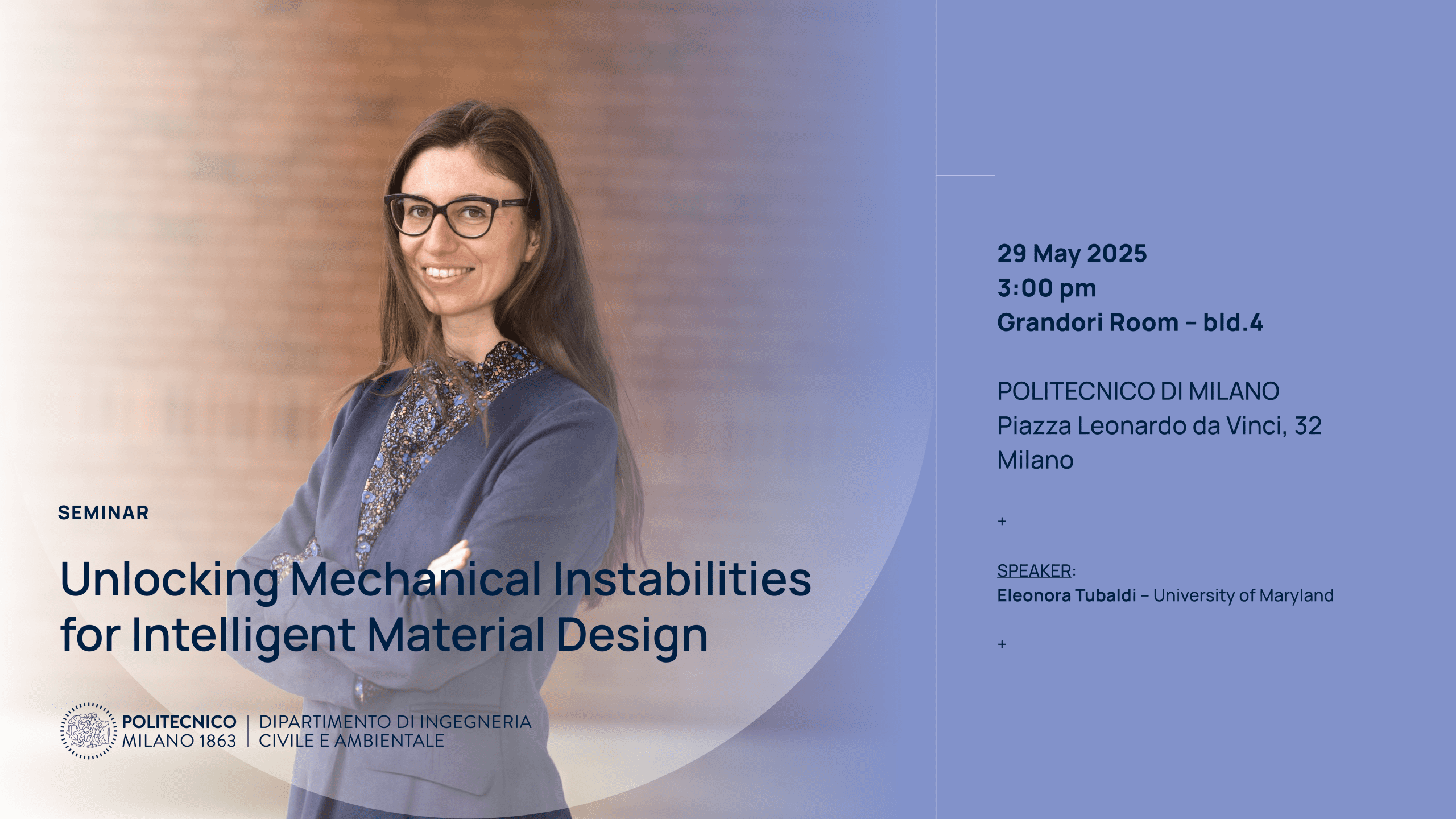 Giovedì 29 Maggio si terrà un seminario presso l’aula Grandori (Edificio 4) dalle ore 15:00 dal titolo “Unlocking Mechanical Instabilities for Intelligent Material Design”.