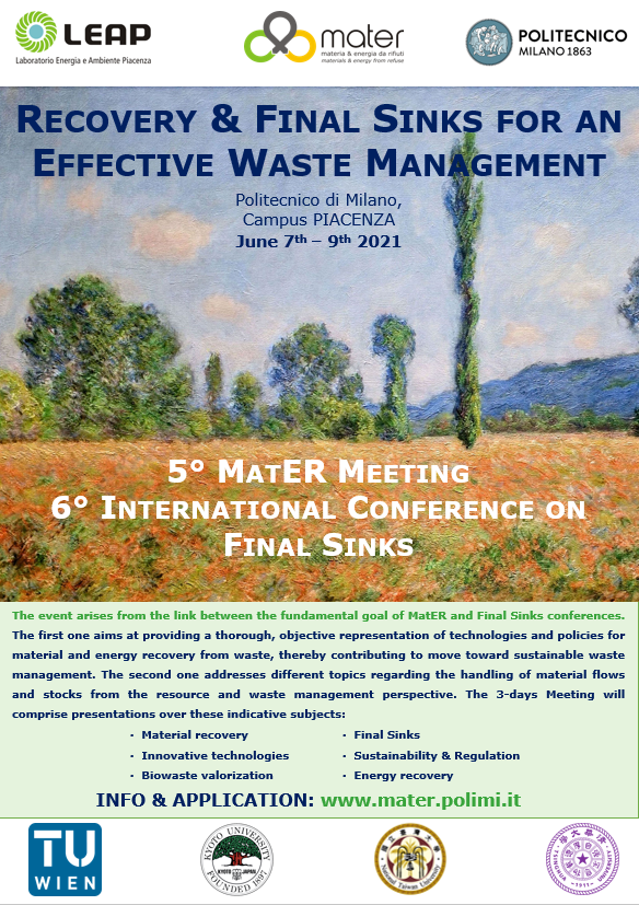 Dal 7 al 9 giugno 2021 presso il campus di Piacenza del Politecnico di Milano, si terrà la quinta edizione del Convegno MatER dal titolo “Recovery & Final Sinks for an Effective Waste Management”, che si terrà in concomitanza con il 6° Convegno Internazionale sui Final Sinks.